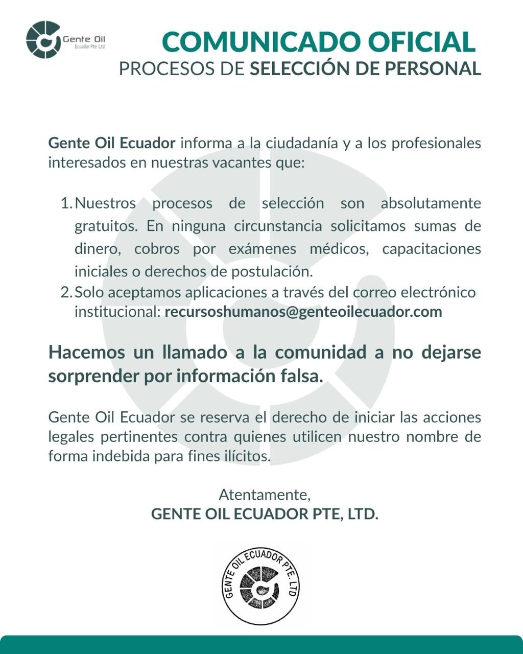Comunicado Oficial En Gente Oil Ecuador, la gestión de talento se desarrolla bajo procesos formales y a través de canales institucionales definidos, alineados a los estándares de la compañía.